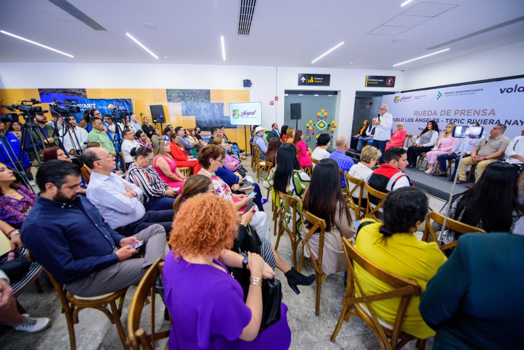 Este miércoles, durante la rueda de prensa realizada en el Aeropuerto Internacional Tepic-Riviera Nayarit, se anunció el nuevo vuelo directo entre Los Ángeles y Tepic. El evento fue encabezado por el gobernador del estado de Nayarit, Miguel Ángel Navarro Quintero, junto a su esposa, la presidenta del Sistema DIF Nayarit, doctora Beatriz Estrada Martínez.