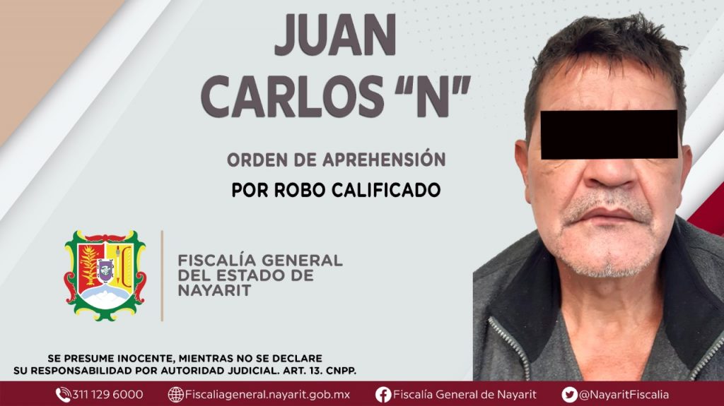 En la capital nayarita, la Fiscalía General de Nayarit a través de la Agencia de Investigación Criminal ejecutó una orden de aprehensión contra Juan Carlos “N”, por su presunta participación en hechos que según apreciación de la ley encuadran el delito robo calificado, cometido en agravio de una persona de sexo femenino de identidad reservada.