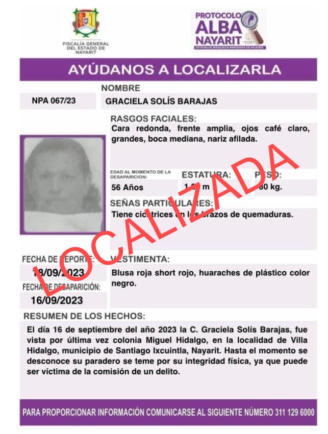 Derivado de que la persona del sexo femenino se encontraba confundida y no brindara información sobre su identidad, los elementos de la Policía Estatal procedieron a realizar la búsqueda en la lista de personas no localizadas, logrando identificar a la femenina de cincuenta y seis (56) años, misma que fuera reportada como no localizada el día 16 del mes y año en curso, siendo vista por última vez en la localidad de Villa Hidalgo, del municipio de Santiago Ixcuintla.