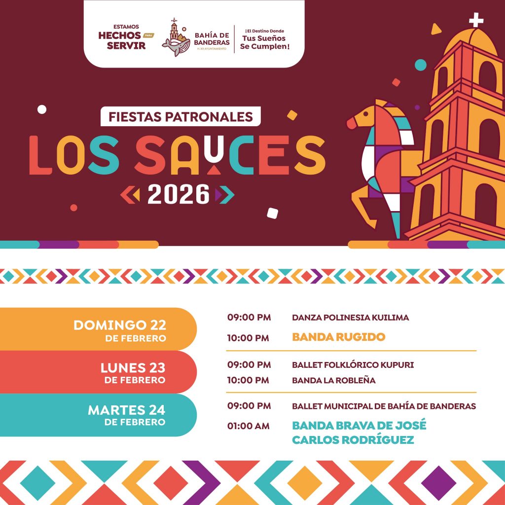 El H. Ayuntamiento de Bahía de Banderas, que encabeza el presidente municipal Héctor Santana, invita a la ciudadanía a disfrutar de las Fiestas Patronales Los Sauces 2026, que se llevarán a cabo del domingo 22 al martes 24 de febrero con un programa artístico y cultural para toda la familia.