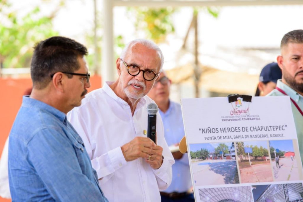 El gobernador del estado, Miguel Ángel Navarro Quintero, visitó la telesecundaria Niños Héroes de Chapultepec, en Punta de Mita, municipio de Bahía de Banderas, donde encabezó la entrega de un domo y la sustitución de las porterías de la cancha, obras realizadas con una inversión cercana a los 2 millones de pesos para que las y los estudiantes cuenten con un espacio adecuado para sus actividades.