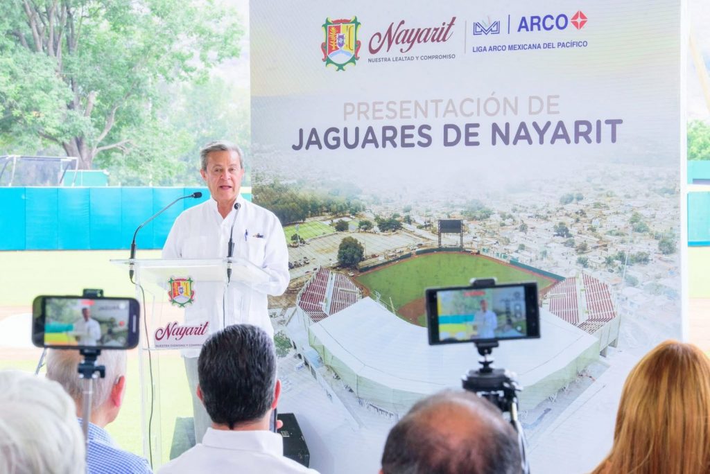 Desde el Coloso del Pacífico, el gobernador, Miguel Ángel Navarro Quintero presentó oficialmente al equipo de béisbol “Jaguares”, que representará a Nayarit en la Liga Arco Mexicana del Pacífico. Acompañado de su esposa, doctora Beatriz Estrada Martínez, presidenta del Sistema DIF Nayarit, celebró este logro como un sueño cumplido para los nayaritas.
