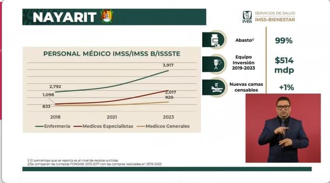 En el caso de Nayarit; hubo una contratación de 3 mil 917 personas para enfermería, más de 2 mil médicos especialistas, 920 médicos generales, y se ha tenido un abasto de medicamentos del 99 por ciento, así como una inversión en equipo de más de 500 millones de pesos.