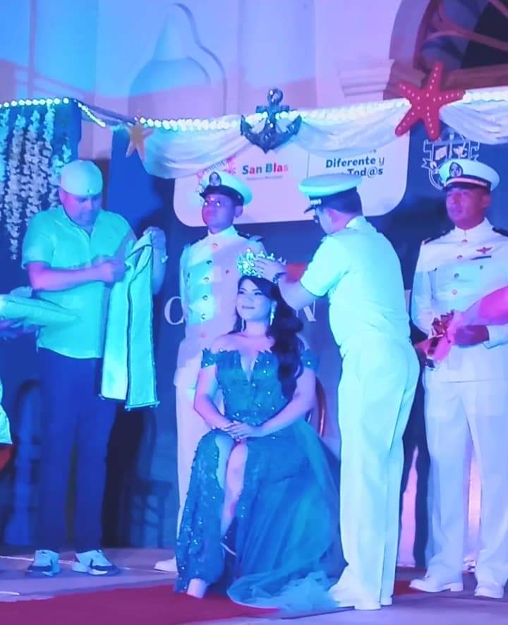 Con la presencia del concurrido público como invitado especial, el Presidente municipal de San Blas; José Antonio ‘Pepito’ Barajas López y el Comandante de la Décima Zona Naval Militar de San Blas; Vicealmirante Cuerpo General Diplomado de Estado Mayor; Raul Sergio Marin Cardenas, coronaron y colocaron banda como distinción honorífica de nombramiento a Elisa Jesamari 1ra:, Soberana Reina de la Marina 2023, después de entregar reinado Jessica Ruíz Inocence.