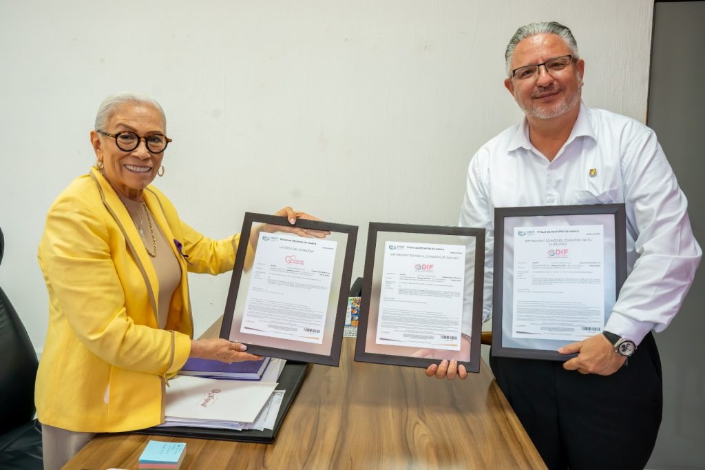 La presidenta del Sistema DIF Nayarit, doctora Beatriz Estrada Martínez, recibió de manos del secretario de Desarrollo Económico y Social de Nayarit, César Octavio Lara Fonseca, los títulos de registro de tres marcas institucionales gestionadas por el organismo ante el Instituto Mexicano de la Propiedad Industrial.