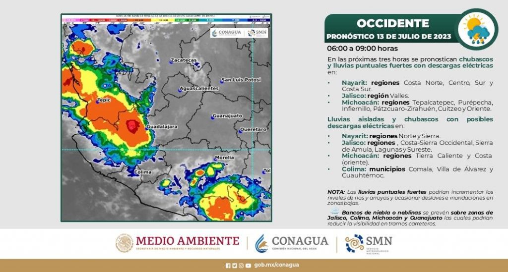 Se pronostica, para el Pacífico Centro, ambiente matutino fresco y caluroso al atardecer, cielo de medio nublado a nublado durante el día, descargas eléctricas y caída de granizo en zonas de lluvia, además de viento de dirección variable de 10 a 25 km/h con rachas de hasta 40 km/h.