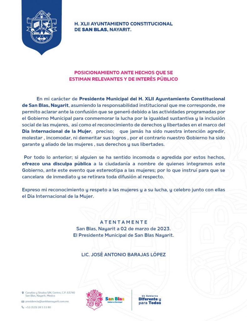 El Alcalde municipal de San Blas Nayarit; José Antonio ‘Pepito’ Barajas López, emitió un posicionamiento ante la confusión generada debido a las actividades programadas por su gobierno para conmemorar la lucha por la igualdad sustantiva y la inclusión social de las mujeres, así como el reconocimiento de derechos y libertades en el marco del Día Internacional de la Mujer.