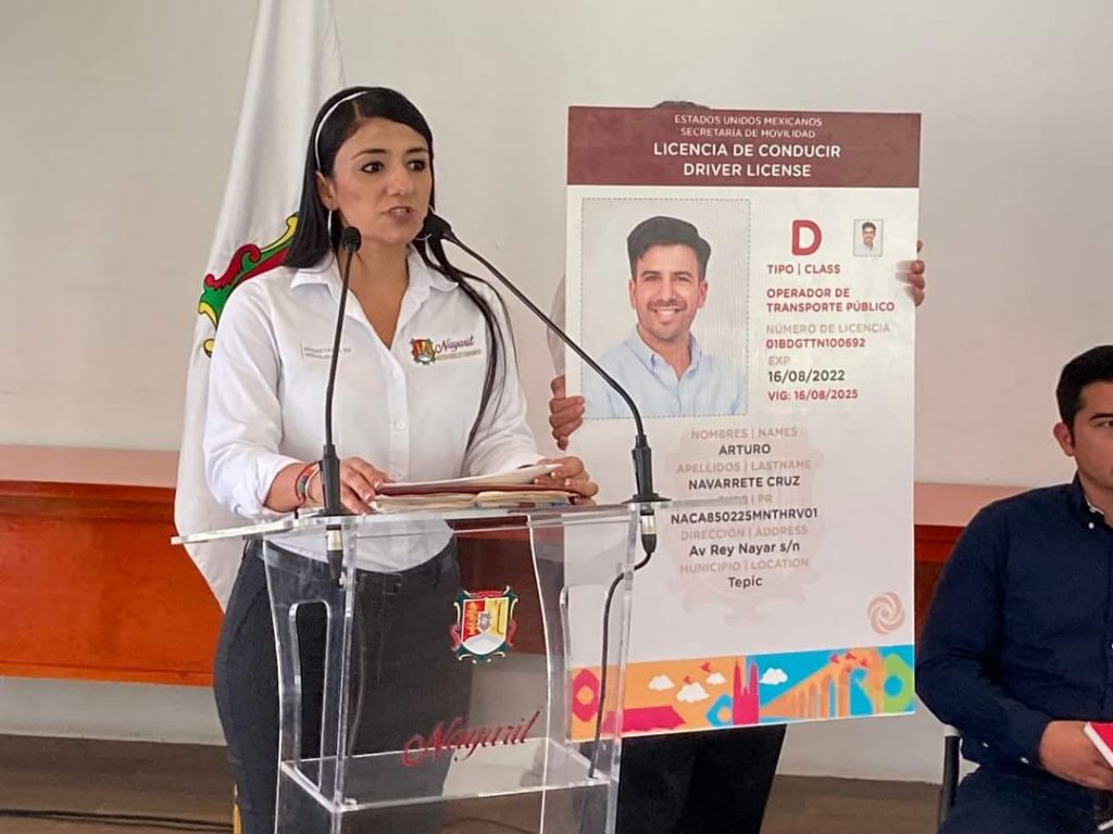La secretaria de Movilidad, Sistiel Buaya, presenta en la conferencia mañanera del gobernador del estado de Nayarit, Miguel Ángel Navarro Quintero, la Licencia de Operador de Transporte Público; Consta de un examen general, examen psicométrico, y toxicológico.