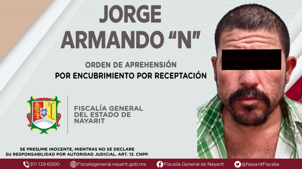 La Fiscalía General del estado a través de la Agencia de Investigación Criminal de Nayarit dio cumplimiento a una orden de aprehensión en la ciudad de Tepic contra Jorge Armando “N”, por su probable participación en hechos que la ley conceptúa como delito de encubrimiento por receptación, cometido en agravio de la sociedad.
