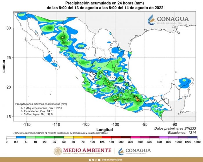 Lluvias fuertes con puntuales muy fuertes (50 a 75 mm): Baja California Sur, Sonora, Chihuahua, Durango, Coahuila, San Luis Potosí, Zacatecas, Aguascalientes, Jalisco, Michoacán, Guanajuato, Querétaro, Puebla, Estado de México, Guerrero, Oaxaca y Chiapas.