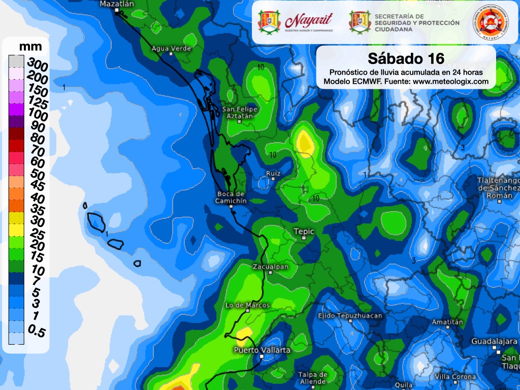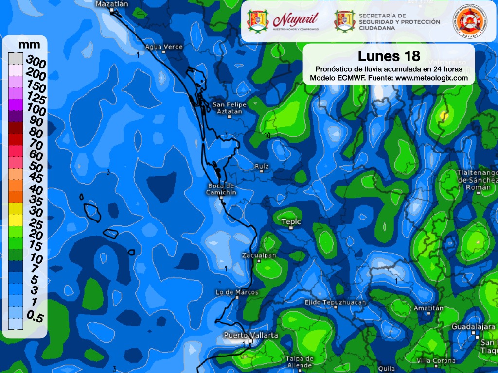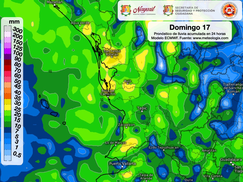Para Nayarit durante este sábado y domingo se prevé aumento de lluvias ligeras a moderadas de 5 a 20 mm en gran parte del estado, sin descartar locales fuetes a muy fuertes de 30 a 50 mm sobre la región norte, sierra y costa sur del estado por la tarde, noche y madrugada, con posibilidad de presentarse durante el amanecer y la mañana. Además el día lunes se prevén condiciones para lluvias ligeras dispersas por la tarde y noche en la entidad.