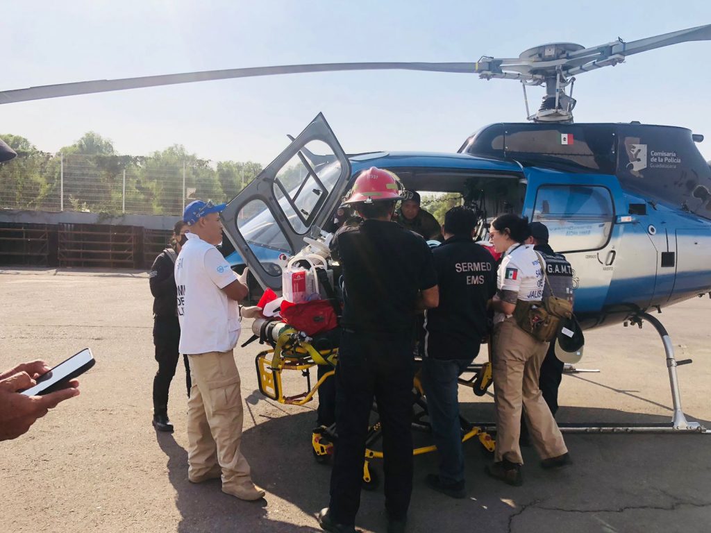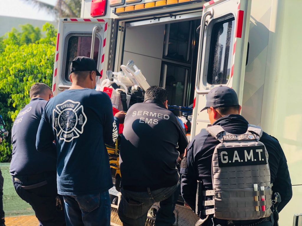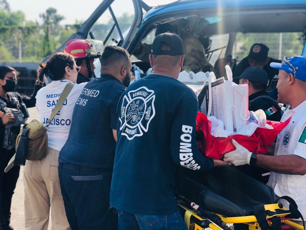 En los trabajos participa el Sector Salud encabezado por su titular, Francisco Munguía, la Secretaría de Seguridad y Protección Ciudadana de Nayarit a través de la Unidad Médica Táctica de la Policía Estatal, Bomberos de Nayarit y el Sistema de Atención Médica de Urgencias de Jalisco con un segundo traslado de un paciente, desde las inmediaciones del Auditorio Amado Nervo con destino a Zapopan, Jalisco, en el angar de la Comisaría de Policía.