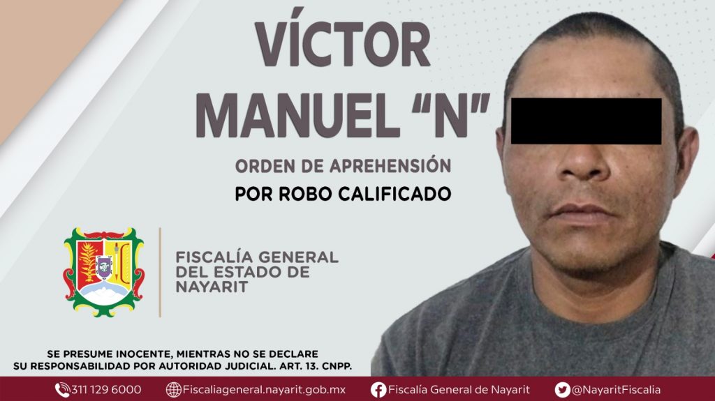Elementos de la Agencia de Investigación Criminal de Nayarit ejecutaron una orden de aprehensión en la ciudad de Tepic contra Víctor Manuel “N”, por su presunta participación en hechos que según apreciación de la ley encuadran el delito de robo calificado, ilícito cometido en perjuicio de una persona de sexo masculino de identidad reservada.