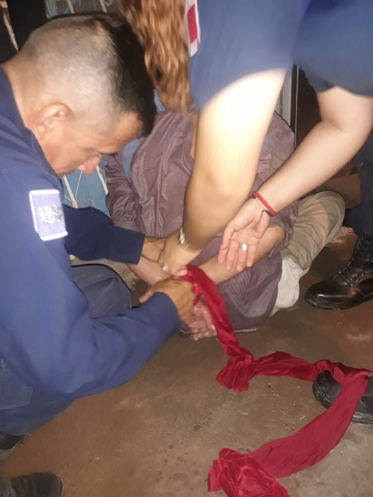 Al lugar arribaron los elementos de seguridad estatal quienes tuvieron a la vista a una femenina agresiva llevando consigo un arma blanca en la bolsa trasera de su short. Los agentes llevaron a cabo las acciones alcanzando a visualizar a un masculino en el suelo amarrado de pies, manos, boca y cuello con pedazos de ropa.
