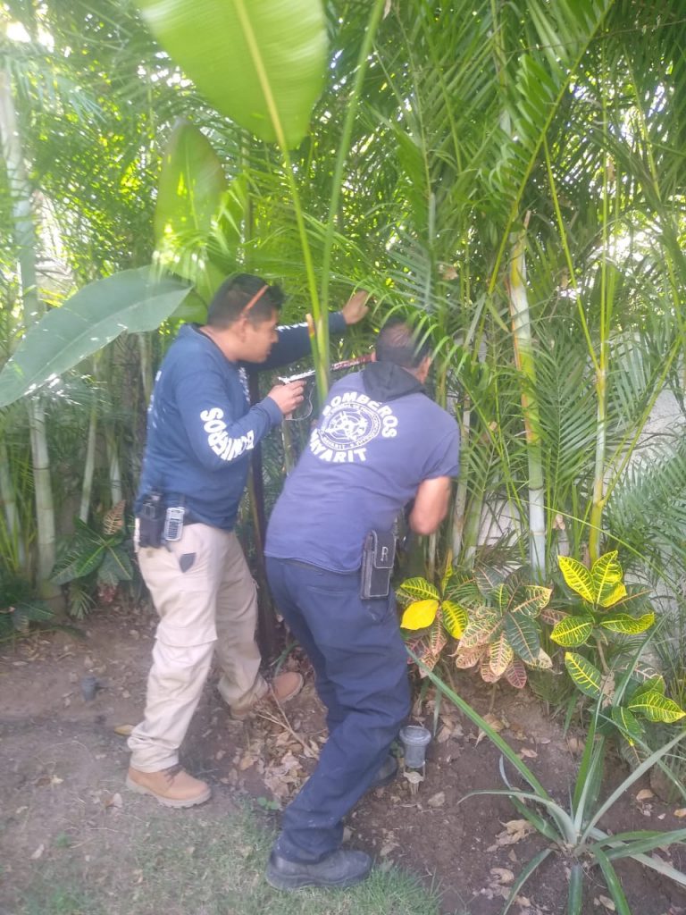 Personal de Protección Ciudadana y Bomberos, pertenecientes a la base regional de Bahía de Banderas, con sede en la localidad de Nuevo Nayarit toman conocimiento del hecho y se dirigen al lugar señalado, donde el reportante señaló el lugar donde observó a una serpiente en el patio de su casa.