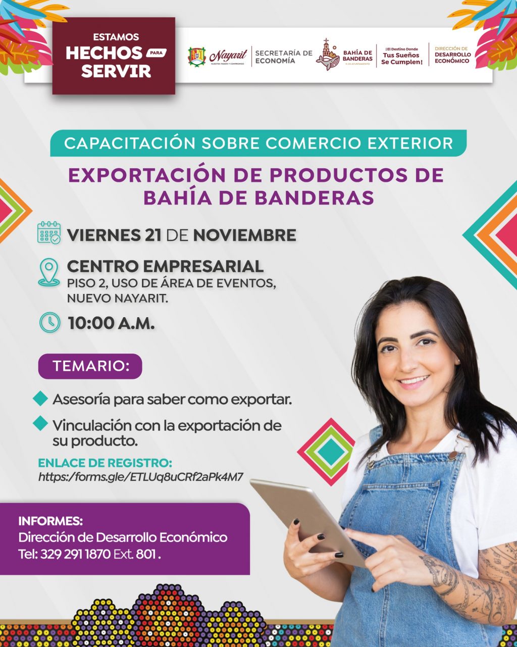 El Gobierno Municipal de Bahía de Banderas, encabezado por el presidente Héctor Santana, a través de la Dirección de Desarrollo Económico y en coordinación con la Secretaría de Economía del Estado de Nayarit, anunció la realización de una capacitación dirigida a emprendedores y negocios locales interesados en incursionar en el comercio exterior.