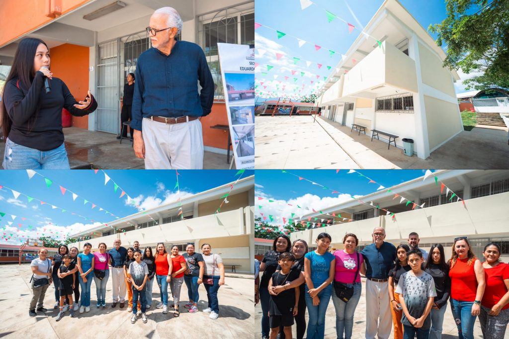 En este plantel, la administración a su cargo construyó dos aulas en el segundo nivel y, además, el ejecutivo estatal se comprometió a entregar computadoras, instruyó la realización de un diagnóstico de la red eléctrica y ordenó la colocación de piso en tres aulas.