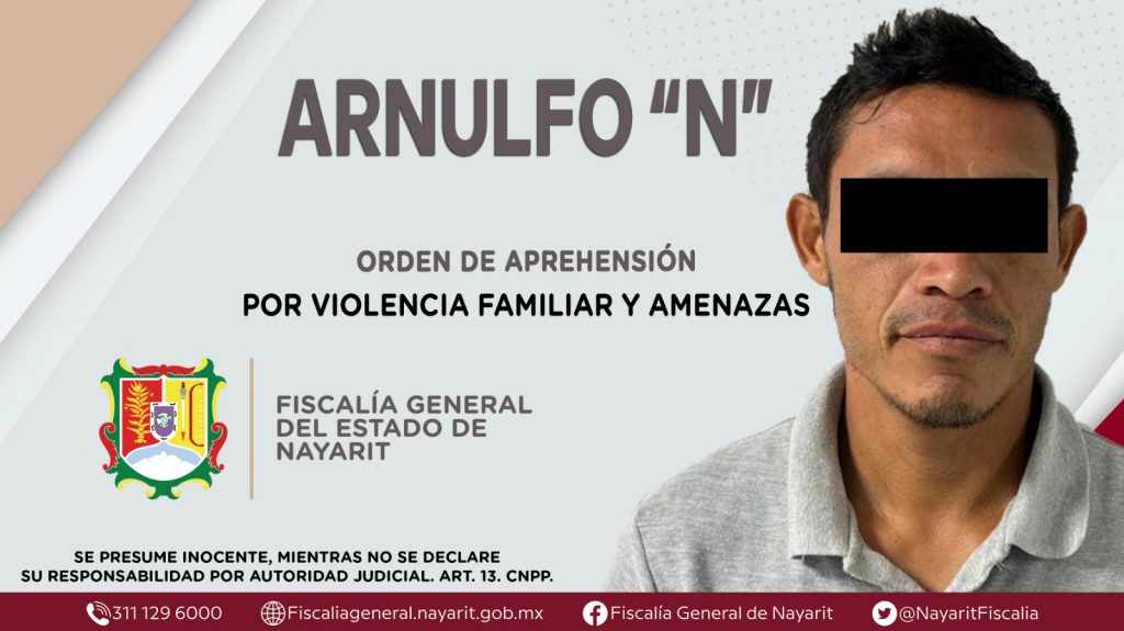 Elementos de la Agencia de Investigación Criminal de Nayarit ejecutaron una orden de aprehensión contra Arnulfo “N”, por su presunta participación en hechos que según apreciación de la ley encuadran los delitos de violencia familiar y amenazas, cometidos en agravio de una mujer cuya identidad es reservada.