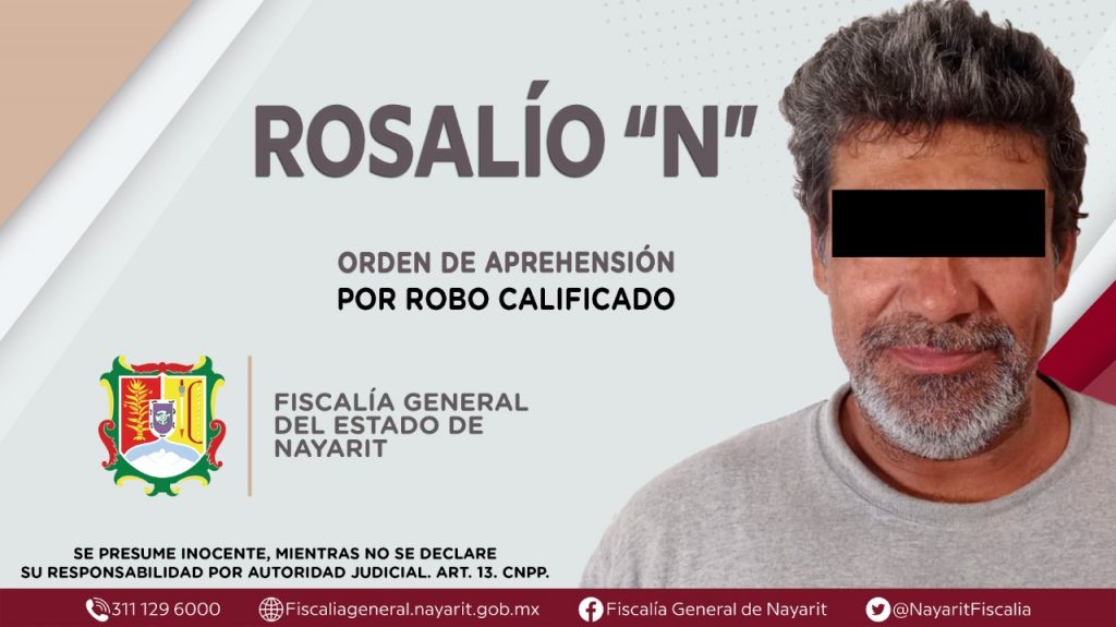 La Fiscalía General de Nayarit a través de la Agencia de Investigación Criminal dio cumplimiento a una orden de aprehensión en la ciudad de Tepic contra Rosalío “N”, quien es originario y vecino de la localidad Tecuitata, municipio de San Blas, por su probable responsabilidad penal en hechos que bajo la apreciación de la ley configuran el delito de robo calificado, cometido en perjuicio de una persona de sexo masculino de identidad reservada.