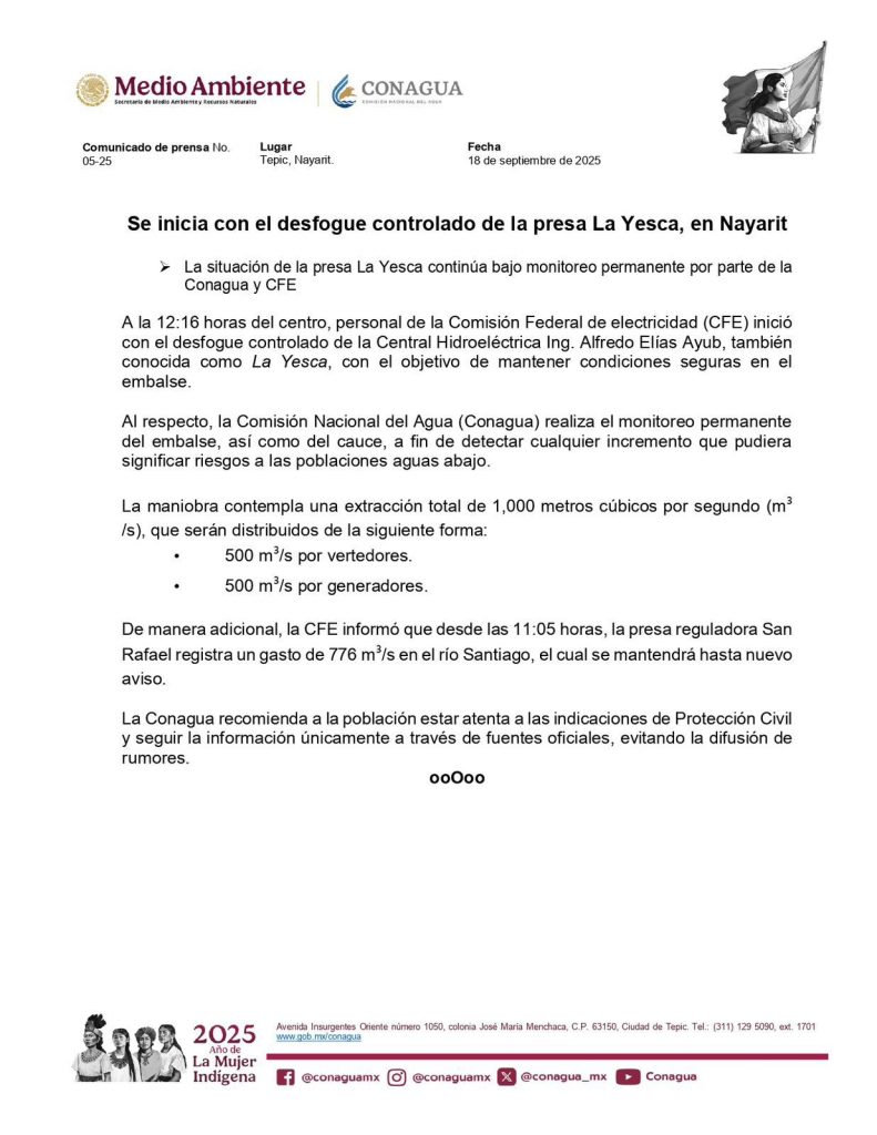 La CFE comenzó con el desfogue controlado de la Central Hidroeléctrica Ing. Alfredo Elías Ayub “La Yesca”, con el fin de mantener condiciones seguras en el embalse.