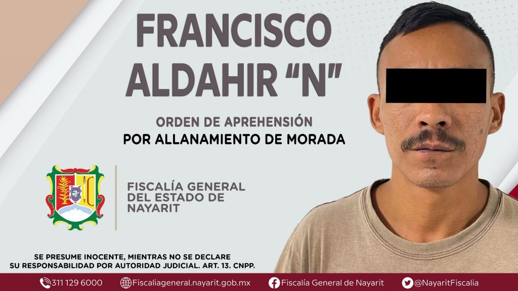 En el interior del Centro de Readaptación Social “Venustiano Carranza”, elementos de la Agencia de Investigación Criminal de Nayarit ejecutaron una orden de aprehensión contra Francisco Aldahir “N”, por su presunta participación en hechos que según apreciación de la ley encuadran el delito de allanamiento de morada, oficina o establecimiento mercantil, cometido en agravio de una persona de sexo masculino cuya identidad es reservada.