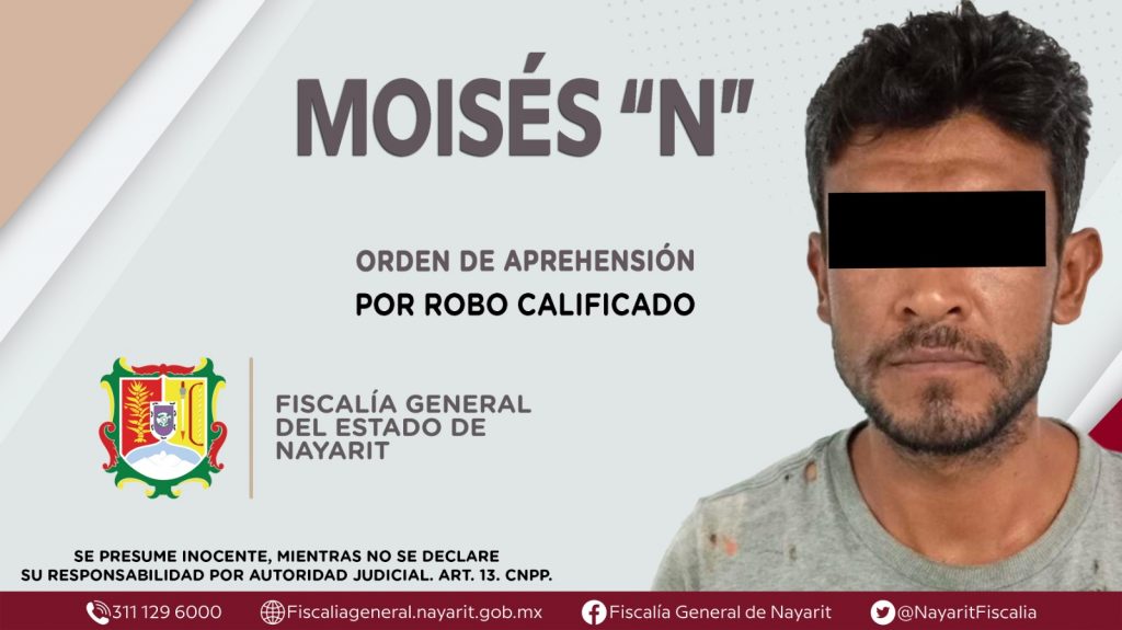 Elementos de la Agencia de Investigación Criminal de Nayarit ejecutaron una orden de aprehensión en la ciudad de Tepic contra Moisés “N”, por su presunta participación en hechos que según apreciación de la ley configuran el delito de robo calificado, cometido en perjuicio de una mujer de identidad reservada.