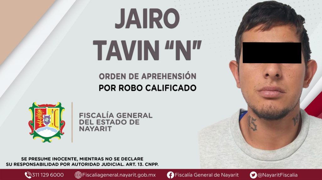La Fiscalía General de Nayarit a través de la Agencia de Investigación Criminal dio cumplimiento a una orden de aprehensión en el interior del Centro de Readaptación Social «Venustiano Carranza” contra Jairo Tavin “N”, por su presunta participación en hechos que según apreciación de la ley configuran el delito de robo calificado, cometido en agravio de dos personas de sexo masculino de identidades reservadas.