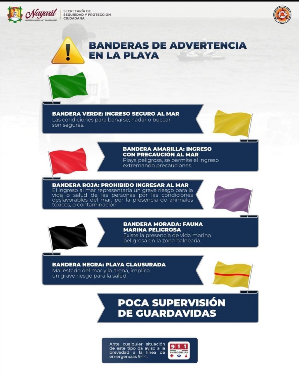 La Dirección General de Protección Ciudadana y Bomberos, te comparte los colores preventivos de banderas de las distintas playas de Nayarit: