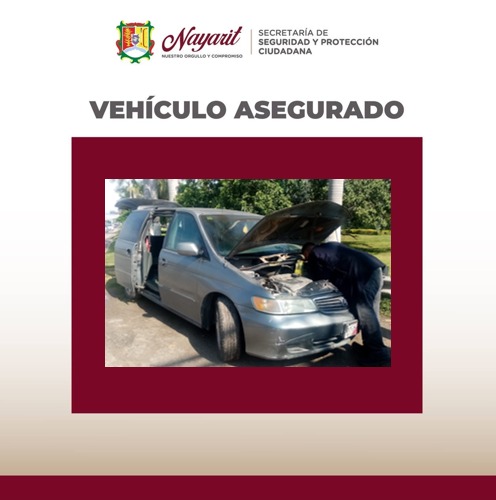 Elementos de la Policía Estatal de la Secretaría de Seguridad y Protección Ciudadana asegura un (1) vehículo en las instalaciones de REPUVE de la localidad de Jarretaderas, en el municipio de Bahía de Banderas.
