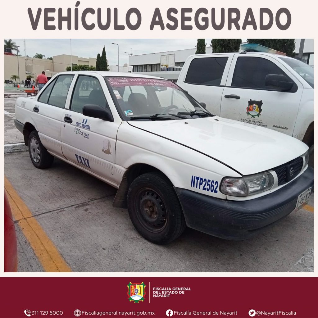 Dicha unidad es de la marca Nissan, tipo Tsuru, modelo 2010, color blanco, con placas de circulación A-952-MDA del Servicio Público del estado de Nayarit; número de serie 3N1EB31S0AK345964. Cabe señalar que el vehículo automotor fue puesto a disposición del Ministerio Público para las gestiones legales que procedan.