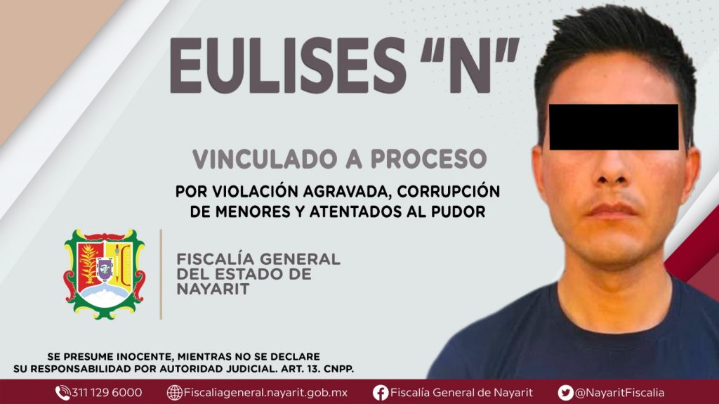 La Fiscalía General del estado de Nayarit a través de la Agencia del Ministerio Público de Bahía de Banderas logró auto de vinculación a proceso contra Eulises “N”, por su presunta responsabilidad en el hecho que la ley señala como delitos de violación agravada, corrupción de menores y atentados al pudor, el primer ilícito cometido en agravio de una niña, en tanto los otros dos delitos fueron cometidos contra otra niña, siendo reservadas las identidades de las víctimas.